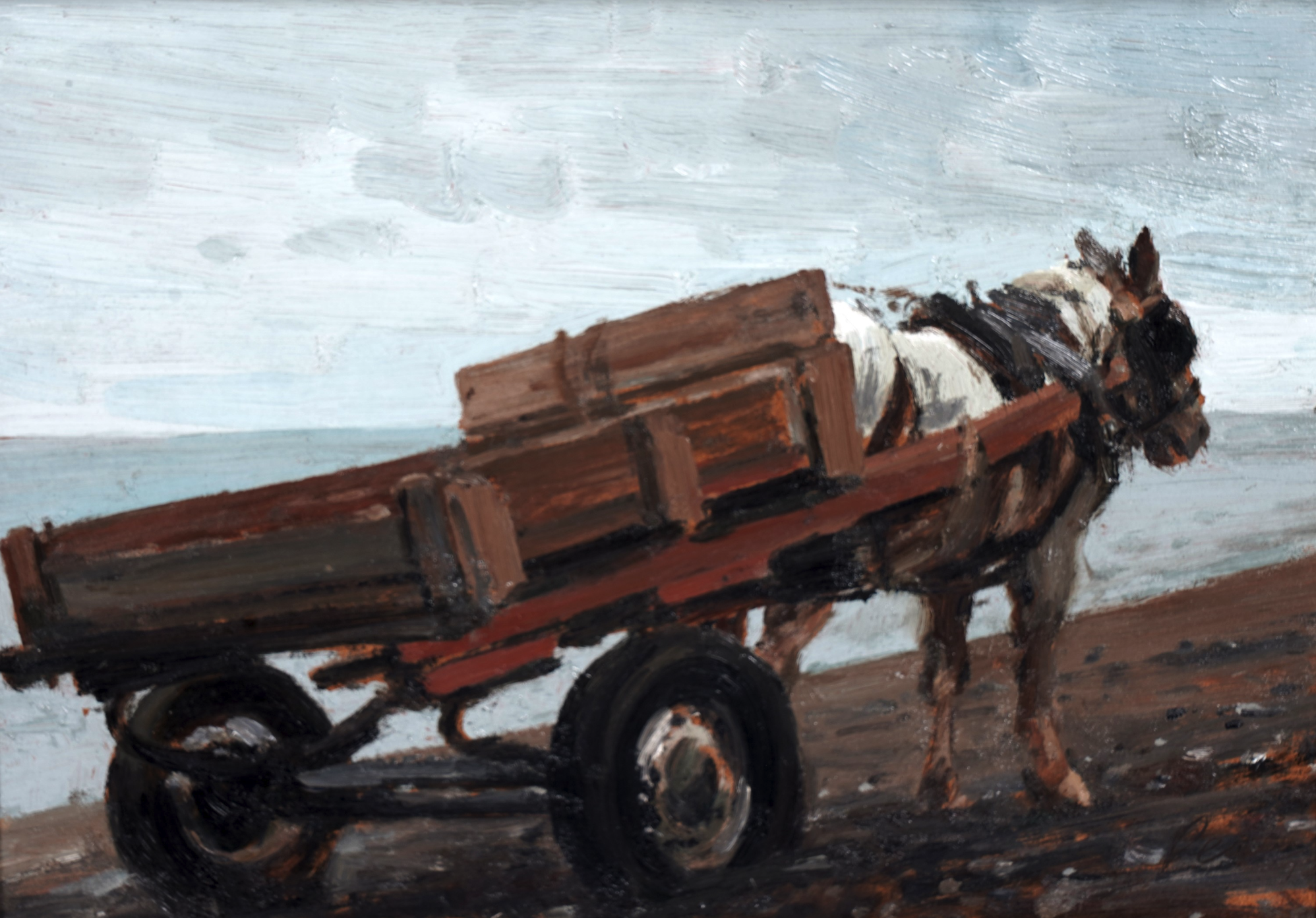 LOT 152 (untitled) is of a horse and cart and we know from similar paintings that it depicts a scene at Lynemouth in Northumberland where sea coal has been collected from the shoreline at low tide from as early as the 7th century. It was hauled into carts pulled by ponies who could get right up to the waters-edge. The coal gathered at Lynemouth was largely sold to the local power station. It is signed, dated 1972 and measures 12”x8.5”